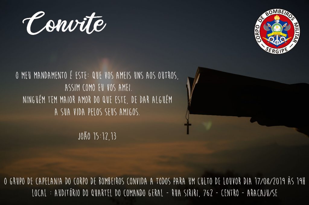 O Corpo de Bombeiros Militar de Sergipe (CBMSE) realiza no próximo sábado (17), no Quartel do Comando Geral da Corporação, na Rua Siriri, Centro de Aracaju/SE, o Culto de Adoração e Louvor e Ação de Graça. O início está previsto para às 19h, no auditório do CBMSE.