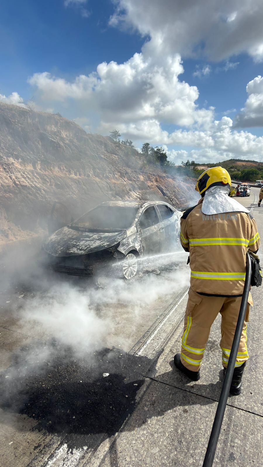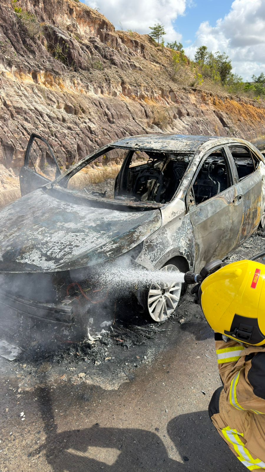“A proprietária informou que estava seguindo na rodovia com destino ao município de Estância quando percebeu fumaça saindo do painel. Ela parou o veículo, tentou conter as chamas com uso de extintor e ajuda de populares, mas sem sucesso, já que o fogo se espalhou rapidamente. Fizemos o combate do incêndio no veículo e da vegetação às margens da rodovia, que também foi atingida pelas chamas”, afirmou o sargento Luciano Tuiuty, que comandou o atendimento à ocorrência.