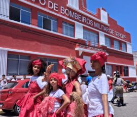 Na manhã desta quinta-feira (04), o Corpo de Bombeiros Militar de Sergipe (CBMSE) recebeu, na sede do quartel central, em Aracaju/SE, o Cortejo de Santa Bárbara, festividade tradicional das religiões de matriz africana realizada há 18 anos e inscrita no Calendário Oficial Cultural do Estado de Sergipe. Conhecido como “Prova de Fogo”, o cortejo teve início no bairro Industrial, percorreu o Mercado Municipal de Aracaju e encerrou-se com uma homenagem aos bombeiros.